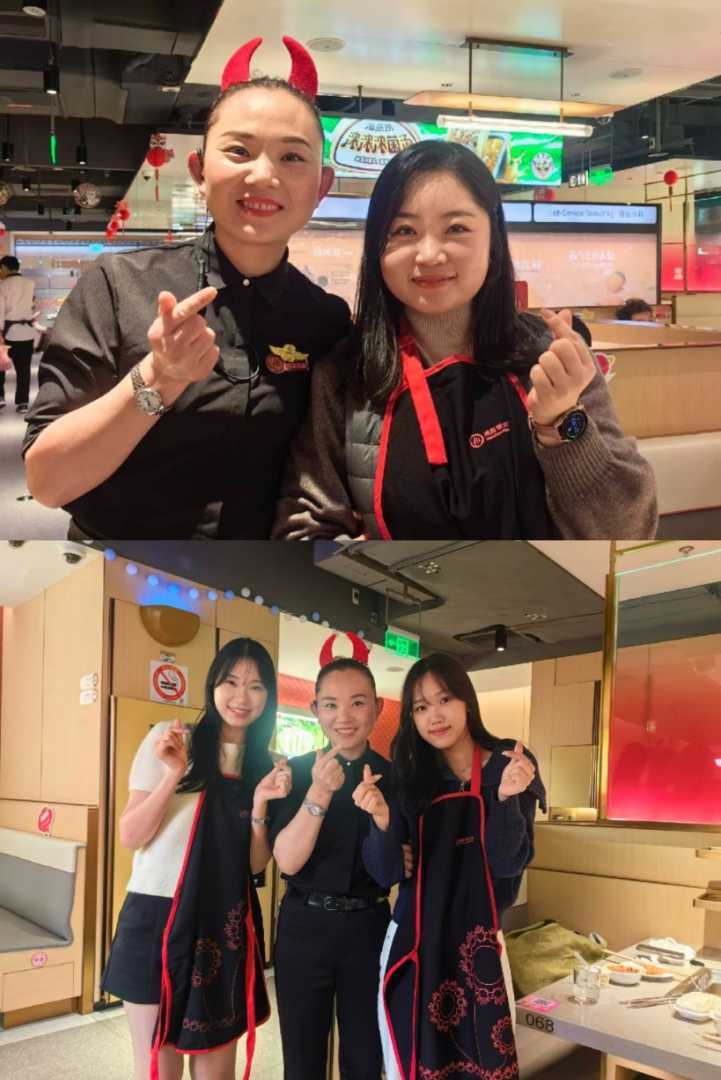 海底捞人民广场店店员与韩国消费者合影,展现了上海餐饮市场的国际化氛围。
