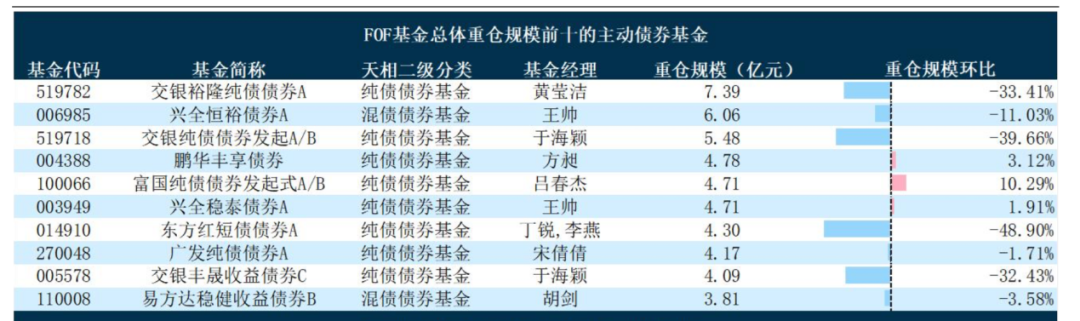 具体到单只基金,交银裕隆纯债债券成为FOF基金重仓规模最高的基金,达到7.39亿元。紧随其后的是兴全恒裕债券,被FOF基金总体重仓达6.06亿元,尽管较上季度有所减少。
