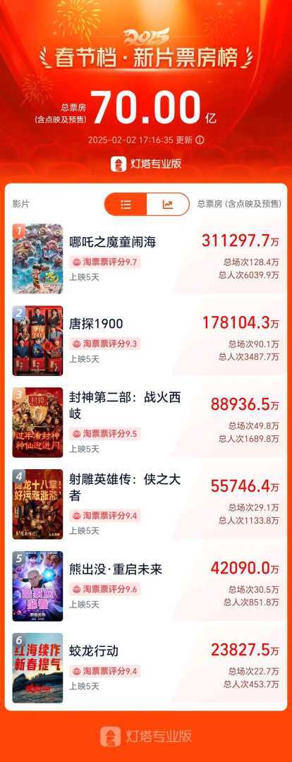 与此同时,2025年春节档票房整体表现强劲。截至2月2日17点16分,春节档票房正式突破70亿元大关,续刷历史春节档同期票房新高。其中,《哪吒2》以31亿元的票房遥遥领先,位居榜首;紧随其后的是《唐探1900》和《封神第二部:战火西岐》,累计票房分别为17.81亿元和8.89亿元。