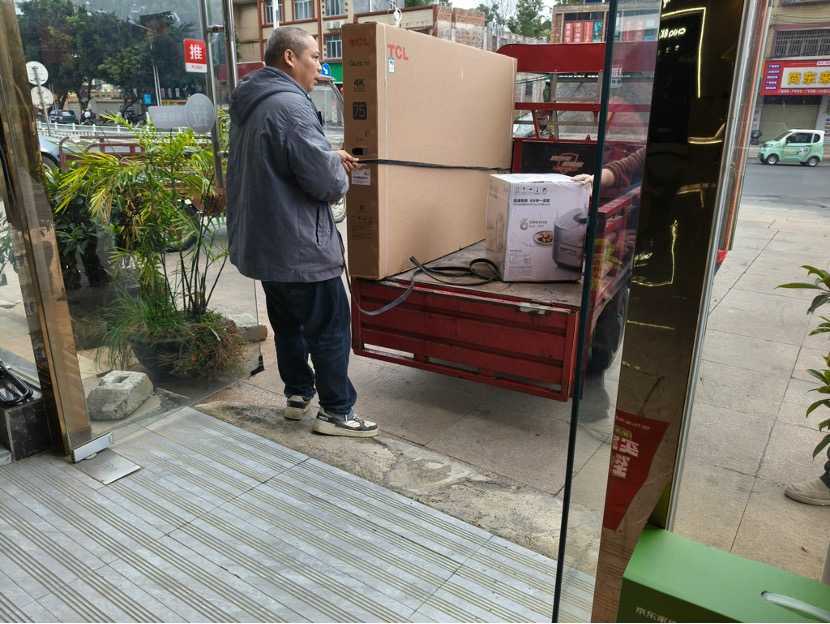 (工作人员将家电装车准备送货上门,财联社记者摄)