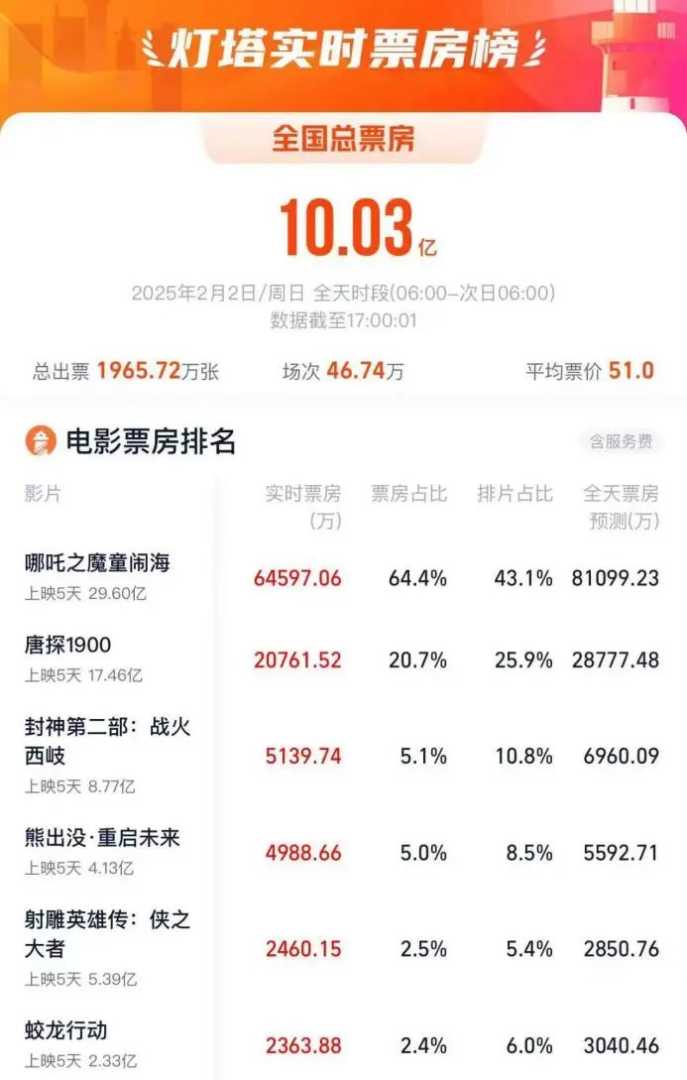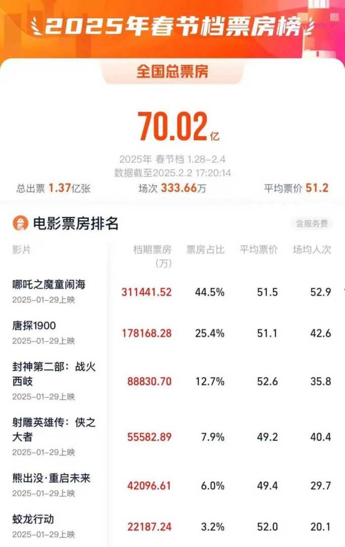 据国家电影专项资金办数据显示,今年春节档首日即1月29日(大年初一),单日票房高达18.08亿元,成功打破2021年2月12日16.81亿元的纪录,创下中国影史单日票房新高。根据灯塔数据,截至2月2日(大年初五)17时,全国单日电影票房再次突破10亿元大关,春节档已连续五天单日票房破10亿元。整个2025年春节档电影总票房已超70亿元,在还剩两日有余的情况下,已逼近去年春节档总票房(80.16亿元),业内人士预测,今年春节档极有可能刷新中国影史春节档最高票房纪录。