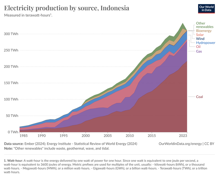 印尼是全球第三大煤炭生产国,2023年煤炭产量创历史新高,达到7.752亿吨,同时也是全球最大的动力煤出口国,出口量占比近全球的一半。然而,印尼政府已明确表示,将加速从煤电向可再生能源转型,不再新建燃煤发电厂,并在2050年前关闭所有燃煤电厂。