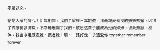 随后,多家媒体跟进报道,证实了这一不幸消息。据ETtoday星光雲官方微博消息,小S发表声明悲痛地证实了大S的离世。大S在春节期间前往日本旅游,不幸感染流感并并发肺炎,最终离世。小S在声明中表示:“感恩这辈子能成为她的姊妹,彼此照顾、相伴,我会永远感激她、怀念她!”