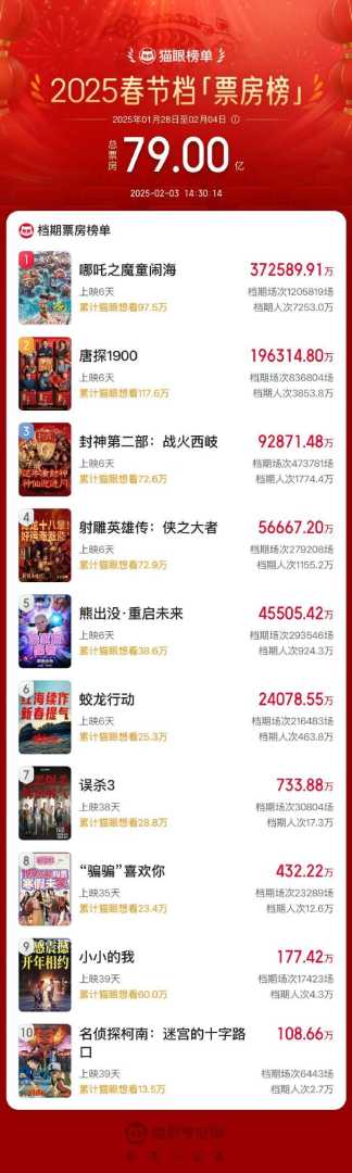 2025年春节档电影市场火爆,总票房已破79亿。《哪吒之魔童闹海》《唐探1900》《封神第二部:战火西岐》三部大片领跑票房榜,为电影行业注入新活力。