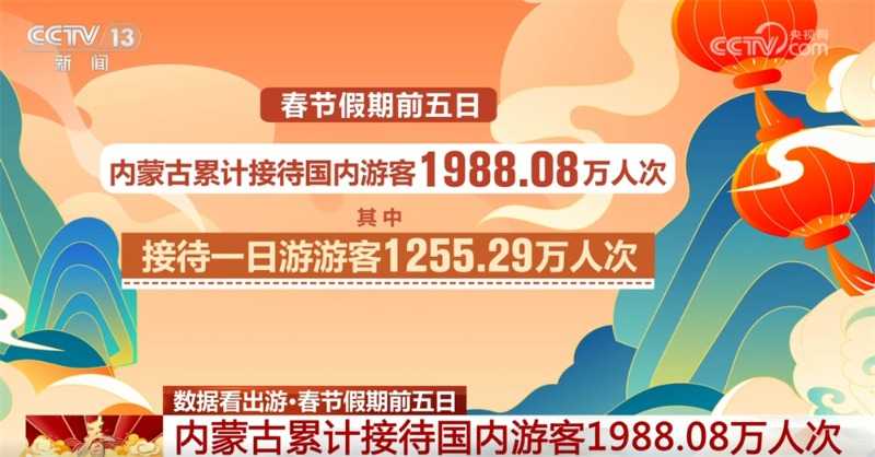 春节期间,内蒙古旅游市场同样火爆。春节假期前五天,全区累计接待国内游客达到了1988.08万人次,其中一日游游客占比超过六成,达到了1255.29万人次。