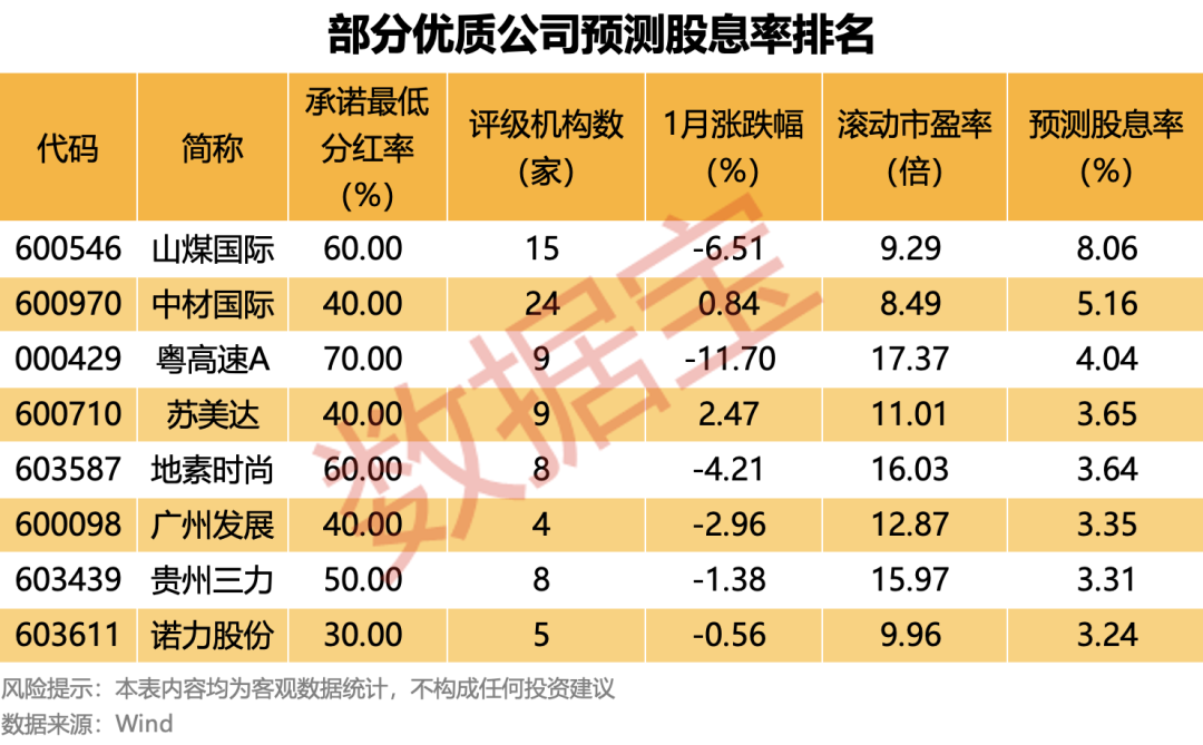 其中,山煤国际、中材国际、粤高速A等公司预测股息率尤为突出。山煤国际2024年每股分红预测超0.89元,股息率有望超8%;中材国际每股分红预测超0.49元,股息率有望超5%;粤高速A每股分红预测超过0.52元,股息率将超4%。此外,苏美达、地素时尚、广州发展、贵州三力、诺力股份等公司预测股息率也均超过3%。