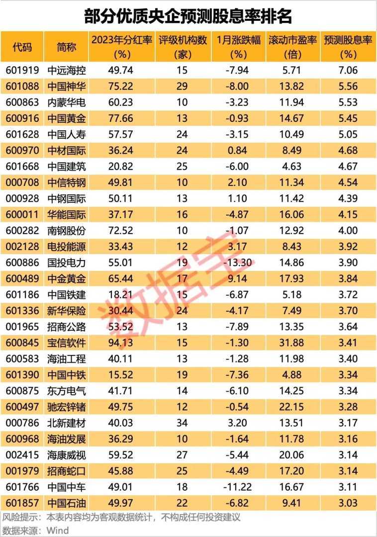 其中,中远海控、中国神华等公司股息率尤为亮眼。中远海控2024年每股派现有望接近1.53元,股息率有望超7%;中国神华2024年每股派现有望达到2.22元,股息率超5%。此外,内蒙华电、中国黄金、中国人寿等个股潜在股息率均超过5%;中材国际、中国建筑、中信特钢、中钢国际、华能国际等潜在股息率均超过4%。值得注意的是,中材国际同时出现在股东回报规划和央企高回报率两张排行榜中,进一步验证了其高股息潜力的合理性。