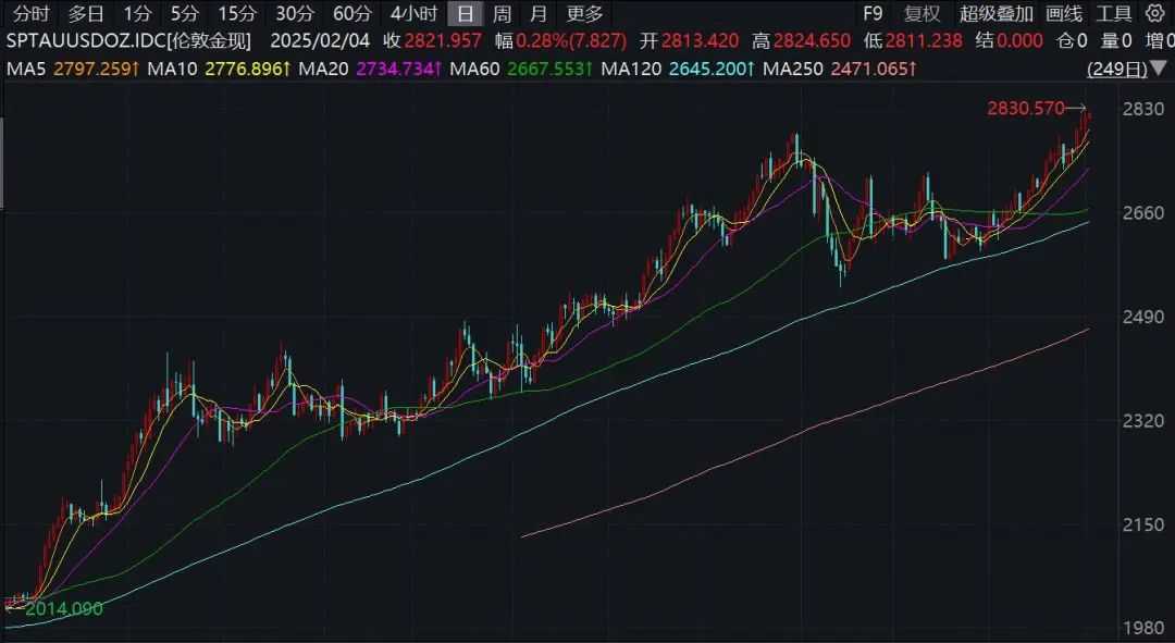 本周一纽约尾盘,现货黄金上涨0.56%,报价2814.2美元/盎司,日内交投区间为2772.23美元至2830.74美元,盘中再创历史新高。同时,COMEX黄金期货也上涨0.55%,报价2850.5美元/盎司,日内交投区间为2802.20美元至2872美元,同样刷新历史记录。