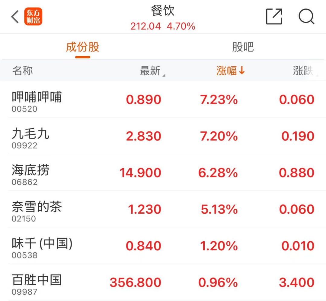 港股市场餐饮股今日也集体大涨,呷哺呷哺、九毛九、海底捞、海伦司和奈雪的茶等多只股票涨幅显著。这反映出市场对餐饮行业的乐观预期。
