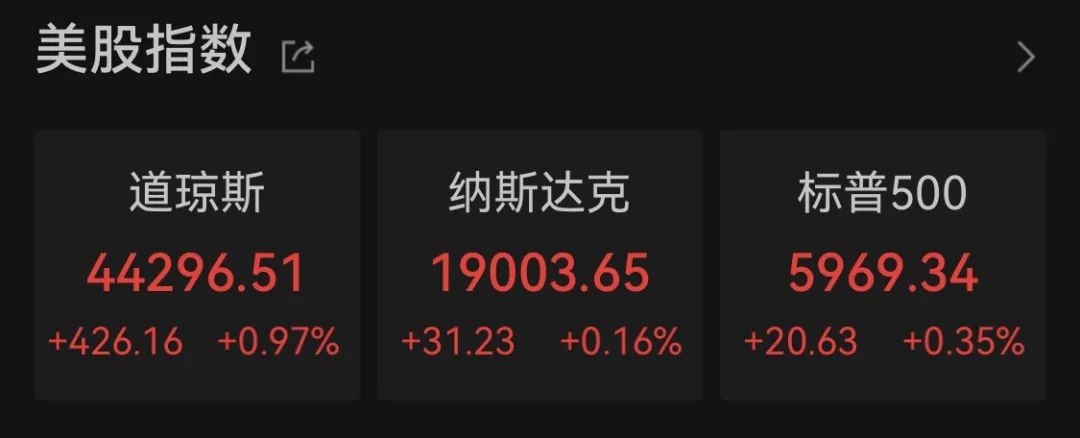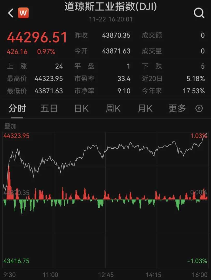 11月22日,道琼斯工业平均指数收盘上涨0.97%,报44296.51点;标普500指数上涨0.35%,报5969.34点;纳斯达克综合指数上涨0.16%,报19003.65点。本周内,道指上涨1.96%,标普500指数上涨1.68%,纳斯达克综合指数上涨1.73%。