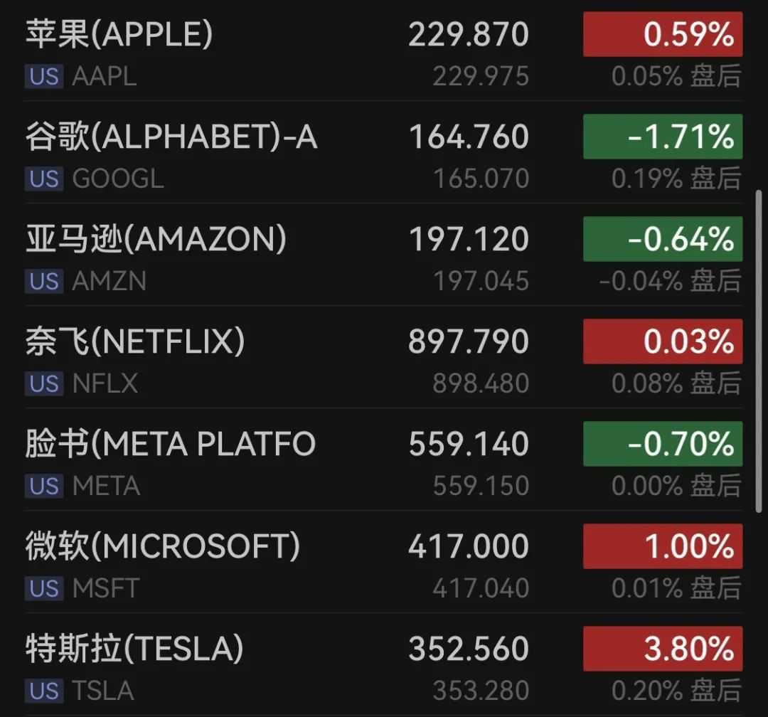 大型科技股多数下跌,英伟达、谷歌、脸书和亚马逊均下跌,而苹果和特斯拉则上涨。
