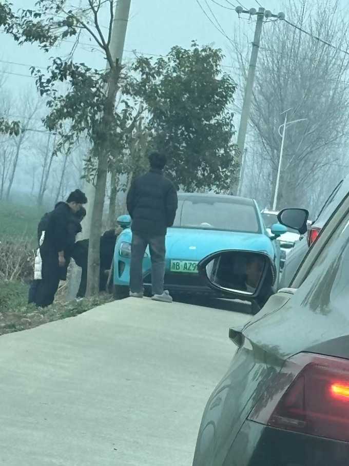 在邓州某乡道上,由于车道有限,一辆小米SU7卡在了道路边缘,成为了春节期间邓州交通状况的一个缩影。图片来源:时代周报记者摄