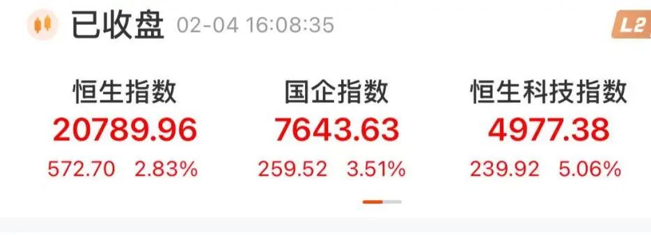 2月4日午后,港股市场延续了近期的上涨势头,尤其是科技股在尾盘时段涨幅进一步扩大。截至当日收盘,恒生指数强势上涨2.83%,报收于20789.96点;恒生国企指数同样表现不俗,涨幅达到3.51%,报收7643.63点;恒生科技指数更是大涨5.06%,报收4977.38点。在春节假期期间,港股市场虽然仅交易了三个交易日,但恒生指数依然累计上涨了2.93%。