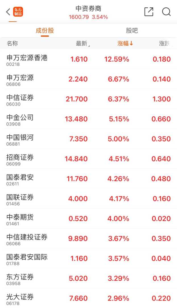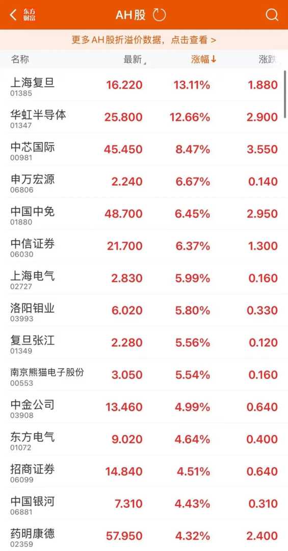 在A股开盘前,市场投资者普遍持乐观态度。午后,A+H股市场集体上扬,其中上海复旦股价涨幅超过13%,华虹半导体涨幅超过12%,中芯国际涨幅超过8%,中国中免也上涨超过6%。被誉为“牛市旗手”的券商股H股同样表现出色,多只个股午后走高,申万宏源和中信证券的涨幅均超过6%。