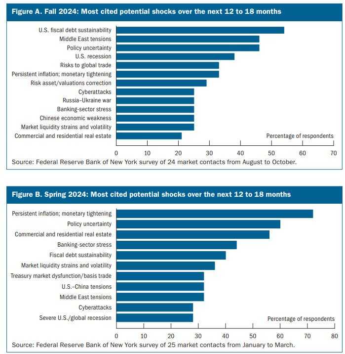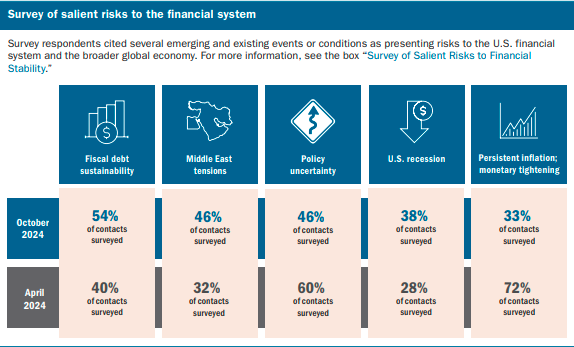 美联储的半年度金融稳定报告指出,围绕美国财政债务可持续性的担忧在本次调查中位列第一,紧随其后的是中东紧张局势升级和政策不确定性。这项调查由纽约联储在8月底至10月底期间进行,覆盖了经纪交易商、基金、咨询公司等机构和学界的人士。