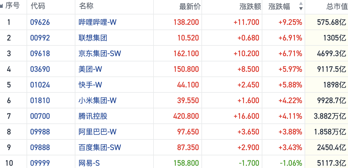 盘面观察,今日科技龙头股成为市场上涨的主要动力,除网易微跌超过1%外,其余科技股均大幅上扬。其中,哔哩哔哩飙升超过9%,联想集团接近7%的涨幅,京东上涨逾6%,美团与快手也均录得超过5%的涨幅。