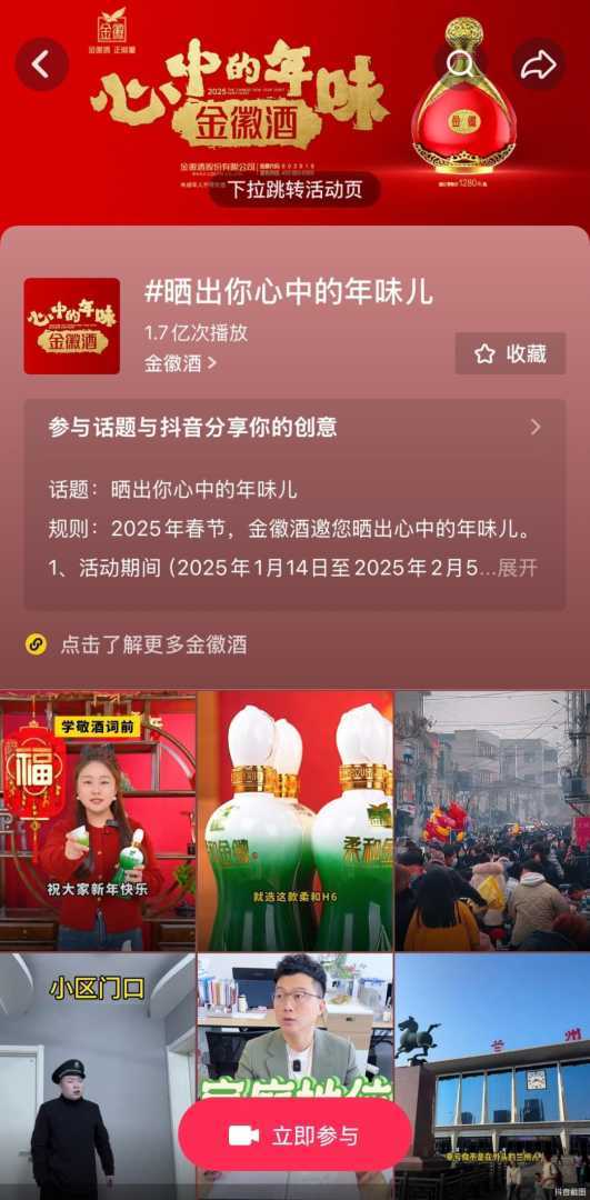 微博平台上,郎酒的“#喝红花郎酒看央视春晚#”话题阅读量近亿;山西汾酒的“#青花汾酒让年味更浓#”话题阅读量高达1.8亿;古井贡酒的“#过大年喝古井看春晚#”话题阅读量也超过了7000万。抖音平台上,金徽酒和五粮液的话题播放量也分别达到了1.7亿次和2000多万次。这些数据显示出酒企春节期间营销的强劲势头。