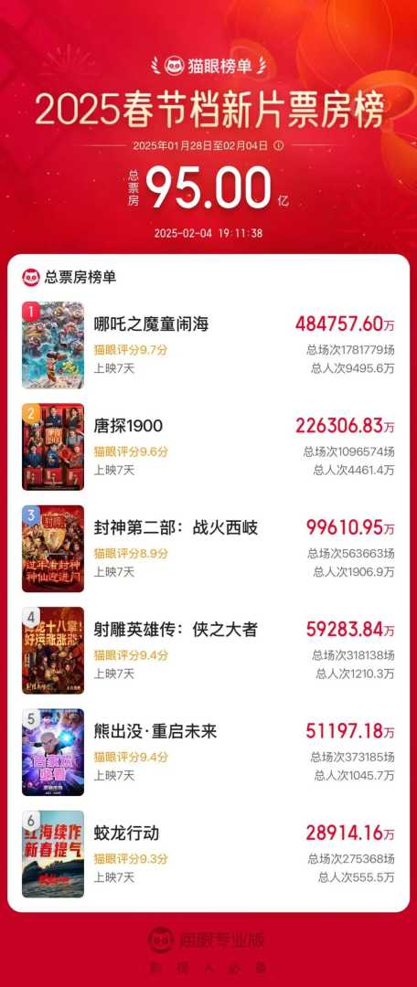 2025年春节档电影市场大放异彩,总票房已突破95亿元大关,观影人次高达1.84亿,刷新了中国影史春节档的最高纪录。其中,《哪吒之魔童闹海》以超5成的档期票房贡献稳居榜首,成为当之无愧的“票房之王”。