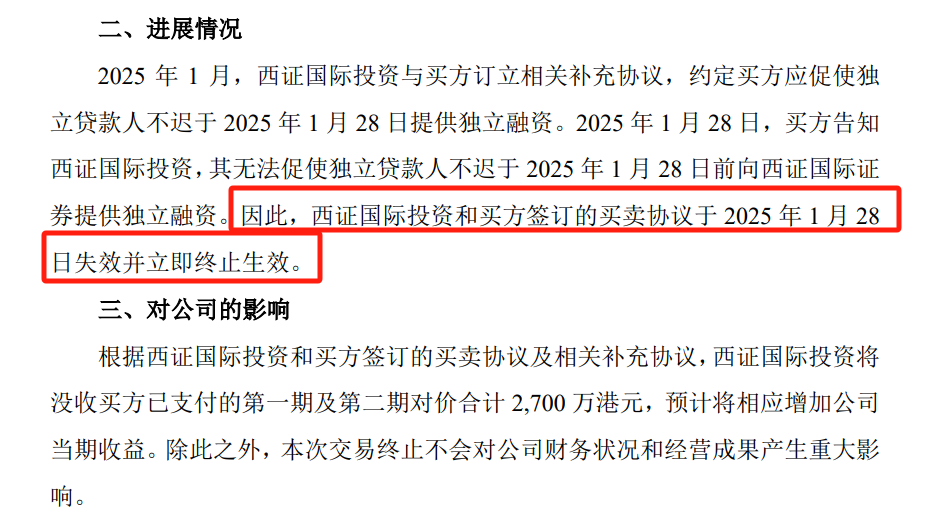 2月4日下午,西南证券正式对外宣布,其全资子公司西证国际投资与买方黄文轩之间签订的关于西证国际证券股份及永续证券的买卖协议,已在1月28日失效并终止生效。根据协议条款,西证国际投资将有权没收买方已支付的首期及二期对价共计2700万港元,此举预计将为公司当期收益带来正面影响。