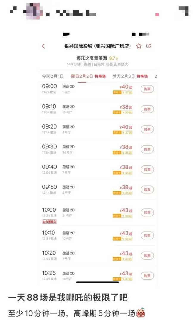 河南鹤壁某影院更是创下了单日排映88场《哪吒2》的纪录,网友反映平均10分钟就有一场放映,高峰期甚至缩短至5分钟一场。影院内凌晨一点仍座无虚席,甚至有场次接近凌晨3点散场时依旧爆满。