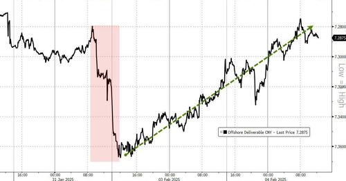 在亚洲地区,马来西亚林吉特和泰铢领涨。而离岸人民币兑美元在连续两个交易日大幅反弹后,已基本收复了春节假期初期的失地。关税对中国市场的全面影响将在周三A股恢复交易后更加清晰。