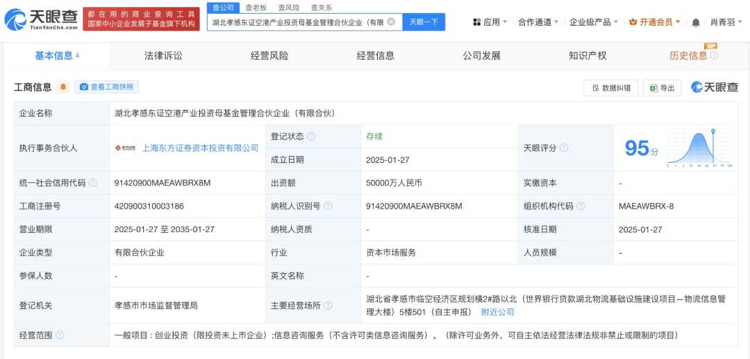 每经AI快讯,据天眼查App最新数据显示,近日,一家名为湖北孝感东证空港产业投资母基金管理合伙企业(有限合伙)的新企业正式成立。该企业执行事务合伙人为业内知名的上海东方证券资本投资有限公司,注册资本高达5亿元人民币。其经营范围广泛,涵盖了创业投资、信息咨询服务等多个领域,展现出强大的资本实力和多元化的业务布局。