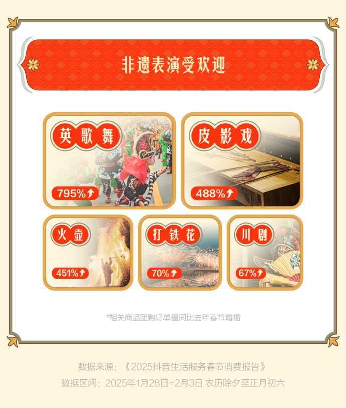 【民俗活动成消费热点】:线上线下共庆新春 春节期间,各地丰富多彩的民俗活动成为大众过年的重要组成部分。抖音平台通过短视频、直播等方式生动呈现这些文化内容,吸引更多人出门体验节日氛围。灯会内容直播观看时长同比增长47%,民俗游园会团购订单量同比增长462%。英歌舞、皮影戏等非遗文化也备受关注,相关团购订单量大幅增长。