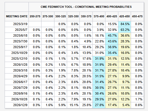 尽管美联储政策制定者相信价格压力将继续缓解,但他们也在密切关注特朗普政府的关税、移民、税收等政策对经济产生的净影响。根据CME美联储观察工具的数据,投资者预计美联储将在6月和12月分别下调政策利率0.25个百分点。