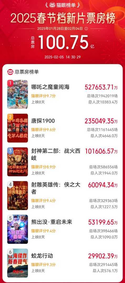 猫眼专业版数据再次确认,2月5日下午,2025年春节档新片票房(含预售)已突破百亿元大关。