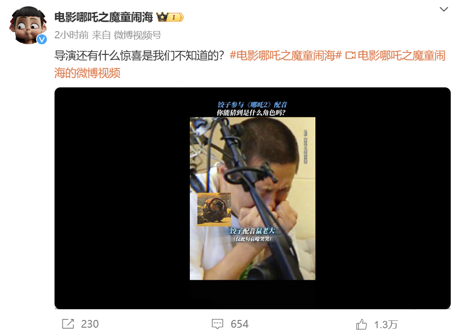 此外,2月5日上午,《哪吒之魔童闹海》官方微博发布视频揭秘:导演饺子亲自参与配音工作。电影中土拨鼠领袖“鼠老大”被哪吒暴揍后的哭声,正是饺子本人的声音。在配音过程中,饺子也多次亲自上阵,为配音工作提出宝贵意见。