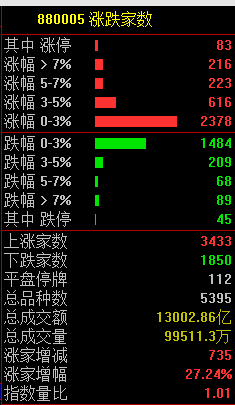 市场内个股表现分化明显,共有3433只个股上涨,其中83只个股强势涨停;而下跌个股数量为1850只。
