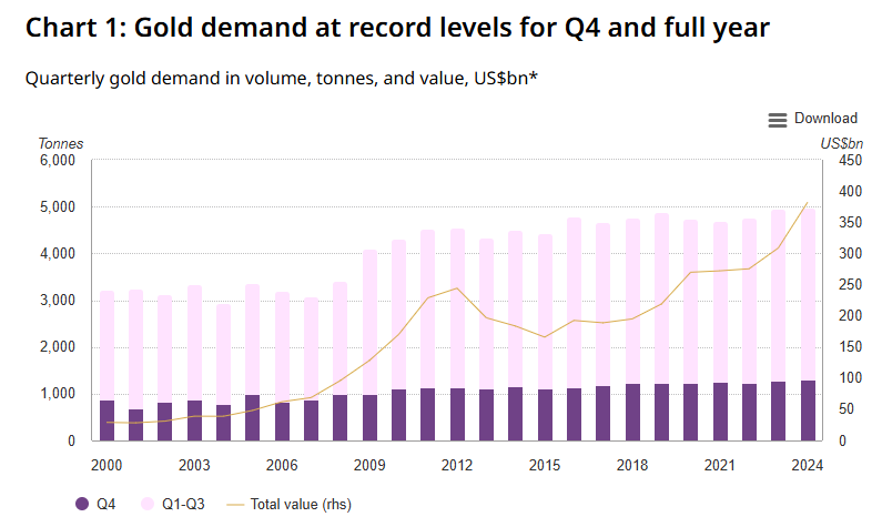 据该报告显示,2024年第四季度,包含场外交易(OTC)在内的黄金总需求实现了1%的同比增长,达到1,297.4吨,而全年总需求同样增长了1%,攀升至4,974.5吨,这两项数据均刷新了季度和年度的历史新高。