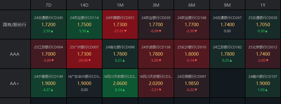 在一级市场方面,今日存单方面表现出一定的市场需求。3M期国股在1.72%-1.8%位置需求较好,较前一日下行1bp;1Y期国股报在1.705%-1.78%的位置,较前一日上行0.25bp。AAA级存单方面,9M成交在1.78%,1Y成交在1.74%的位置。这些数据为投资者提供了一级市场的最新动态。