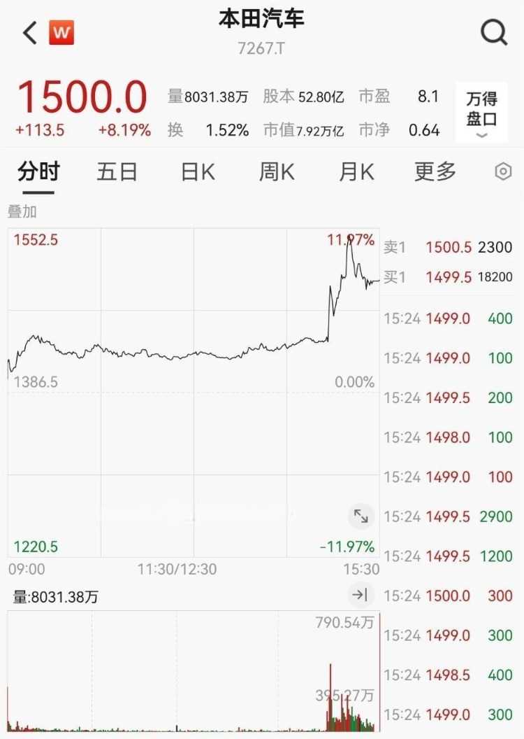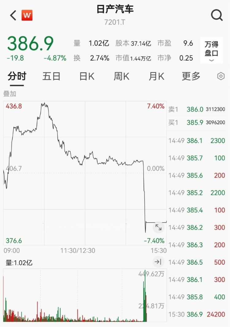 受合并谈判终止消息影响,2月5日下午本田汽车股价短线拉升,涨幅一度接近12%;而日产汽车股价则出现跳水,由涨转跌。东京证券交易所官网同日公布,为核实合并终止消息的真实性,自当地时间14时49分起暂停日产汽车股票交易。停牌前,日产汽车跌幅已达4.87%。