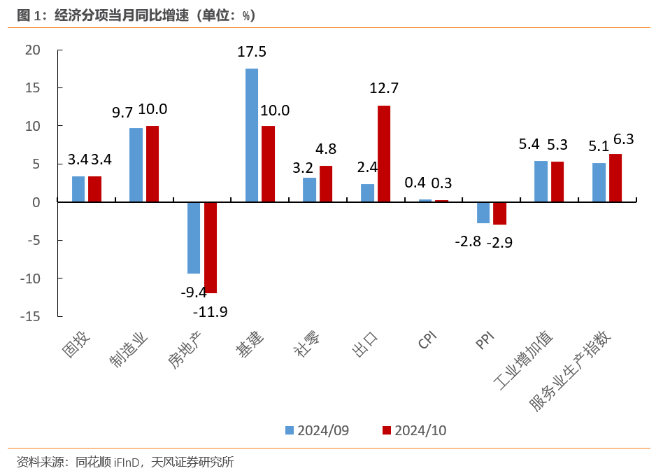 10月社零同比增速显著提升至4.8%,较上月增长1.5个百分点,消费已连续两个月呈现向好态势,并重返波动区间的上沿。受服务业生产指数增长的推动(10月增长1.2个百分点至6.3%),我们预测10月GDP同比增速将增长0.3个百分点至5.1%。展望四季度,社零增速有望继续维持在波动区间的上沿,为全年5%的增长目标提供坚实支撑。