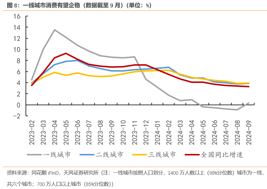 此外,10月消费还呈现出区域分化收敛的特征,城镇消费修复速度强于乡村消费,城乡之间的零售增速差距明显缩小。未来,房价降幅收敛和股票财产性收入上升有望对城镇居民消费形成持续性利好。