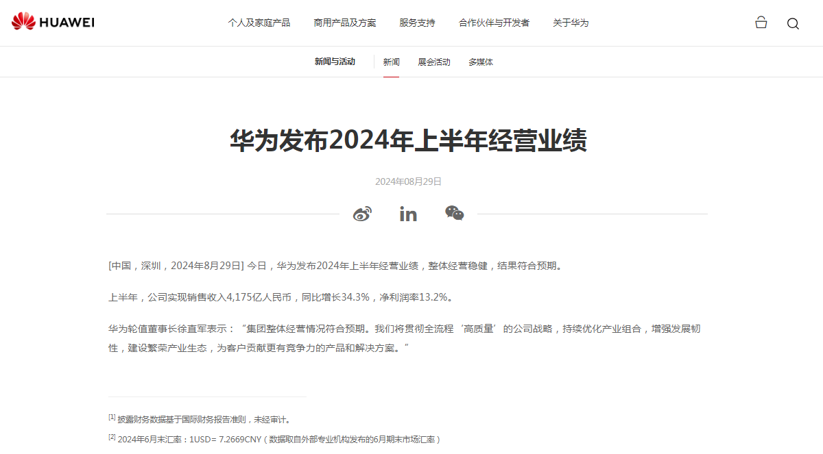 2024年8月29日,华为公司正式公布了其上半年的经营业绩报告。据报告显示,华为在2024年上半年实现了销售收入的显著增长,总额达到了4175亿人民币,与去年同期相比,增幅高达34.3%。同时,公司的净利润率也保持在了一个稳健的水平,达到了13.2%。