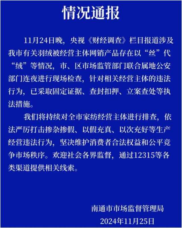 红星资本局11月25日消息,南通市市场监督管理局近日发布通报,针对有报道称南通市部分羽绒被经营主体在网络销售中存在以“丝”代“绒”等欺诈行为,市区两级市场监管部门联合公安部门迅速行动,连夜展开现场检查。对发现的违法行为,已采取固定证据、查封扣押、立案查处等一系列严厉执法措施。