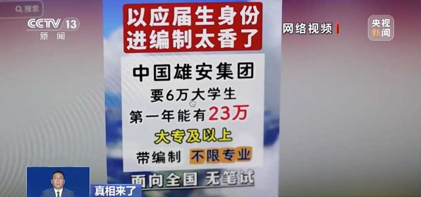 近期,多个短视频平台流传消息称,“中国雄安集团紧急招募数万大学生,专业不限,报名即可加入”,部分视频博主甚至宣称“招聘带有正式编制,年薪高达20万以上”。这些发布者多自称为“就业规划师”、“央国企规划师”,吸引大量网友留言咨询报考及培训事宜。然而,也有网友对此招聘信息的真实性提出质疑。