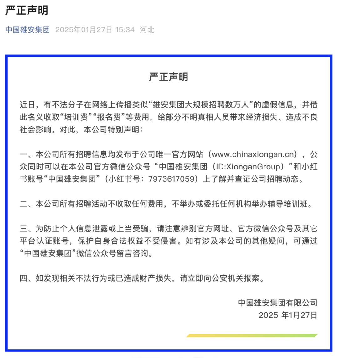 雄安集团迅速作出回应,明确表示:中国雄安集团有限公司所有招聘活动均免费,不举办也不委托任何机构举办辅导培训。同时,雄安集团提醒广大求职者,注意识别官方网址、官方微信公众号及其他官方认证账号,确保个人信息安全,避免上当受骗。若遭遇不法行为或财产损失,请立即报警。