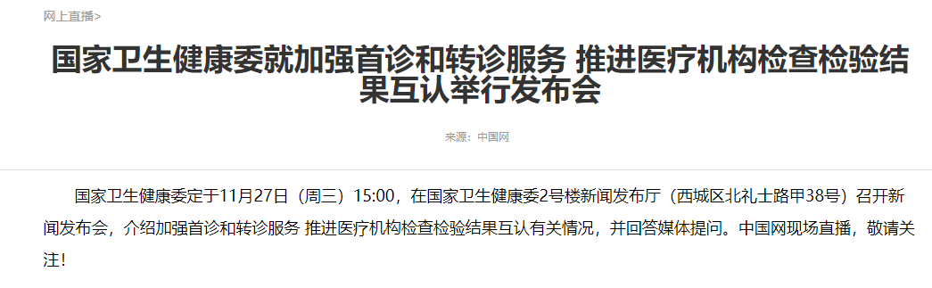 国家卫生健康委员会计划于11月27日(周三)下午3点,在其位于西城区北礼士路甲38号的2号楼新闻发布厅,举办新闻发布会。会议将详细介绍加强首诊和转诊服务的相关措施,以及推进医疗机构检查检验结果互认的最新进展,并预留时间回答媒体提问。