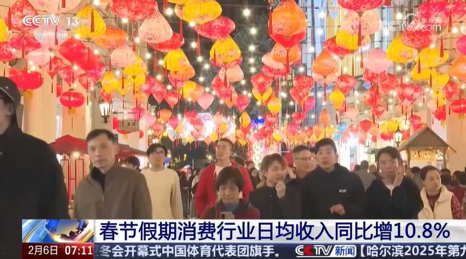 央视网消息:国家税务总局最新发布的增值税发票数据显示,2025年春节假期期间,全国消费相关行业展现出了强劲的增长势头,日均销售收入较去年同期增长了10.8%。其中,商品消费与服务消费分别实现了9.9%和12.3%的同比增长,消费市场亮点纷呈,活力四射。
