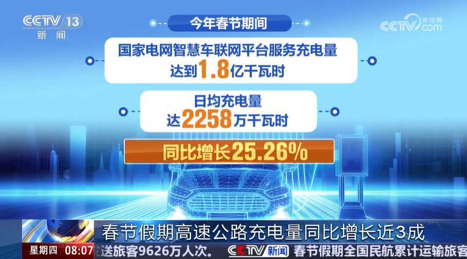 国家电网智慧车联网平台在春节期间的服务充电量也达到了1.8亿千瓦时,日均充电量达2258万千瓦时,同比增长25.26%。高速公路充电量同比增长29.48%,显示出新能源汽车出行的便捷性正在不断提升。
