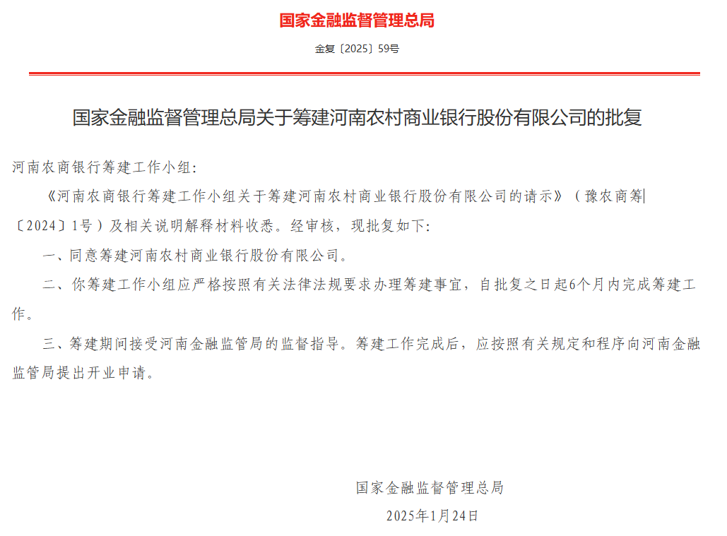 国家金融监督管理总局正式批复同意筹建河南农村商业银行股份有限公司,要求筹建工作小组六个月内完成筹建工作,并接受河南金融监管局的监督指导,为河南农村经济注入新活力。