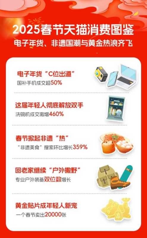 据天猫平台发布的最新数据显示,蛇年春节期间,电子年货、非遗商品、黄金饰品及户外运动装备等商品类别,成为引领今年春节消费潮流的热门之选。这些新兴消费趋势不仅彰显了国民生活品质的提升,也反映了消费者对传统文化与现代科技融合的强烈需求。