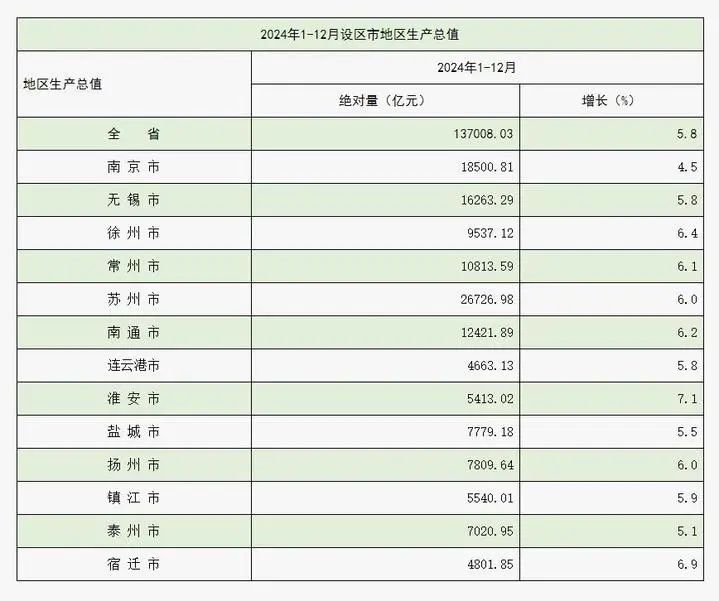 2025年2月7日,江苏省统计局正式公布了2024年度江苏省13个设区市的经济数据。数据显示,江苏省全年地区生产总值达到了惊人的13.7万亿元,同比增长5.8%,彰显了江苏经济的强大韧性和活力。其中,苏州以2.67万亿元的地区生产总值稳居全省榜首,成为江苏省唯一GDP超过两万亿元的城市,持续领跑全省经济。南京、无锡、南通和常州紧随其后,地区生产总值均突破了万亿元大关,形成了江苏经济的“万亿俱乐部”。此外,徐州以9537亿元的地区生产总值,增速高达6.4%,有望成为江苏下一个GDP“万亿之城”。