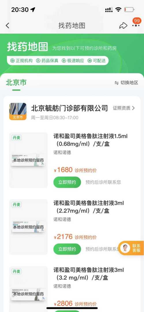 随着诺和盈的上市,多个线上平台已推出司美格鲁肽注射液的预约诊疗服务。记者搜索发现,淘宝、京东等线上平台均有医疗机构提供挂号诊疗拿药预约服务。然而,在预约购买过程中,个别医疗机构在宣传中未明确提示适应症要求,仅在记者一再询问后才表示有要求。此外,有医疗机构表示产品仅支持到分院注射,不能邮寄。