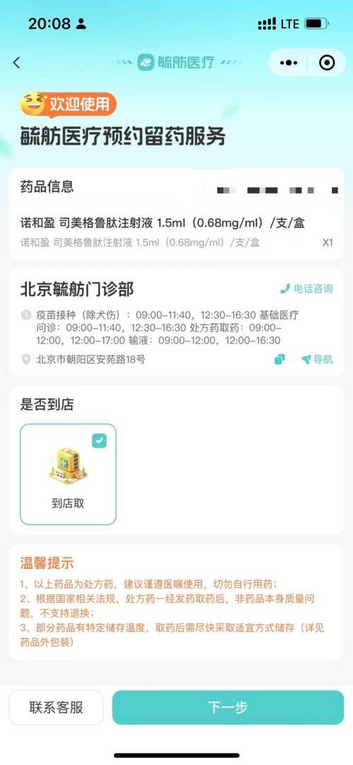 在销售页面上,北京毓舫门诊部等医疗机构展示了诺和盈的营销字样,如“中国首批”“首批限量先到先得”等。记者体验预约过程中,门店客服要求通过短信链接进行预约信息登记,填写个人信息后进行预约取药。对于取药方式是否可以邮寄,客服并未正面回应,只是建议面诊。