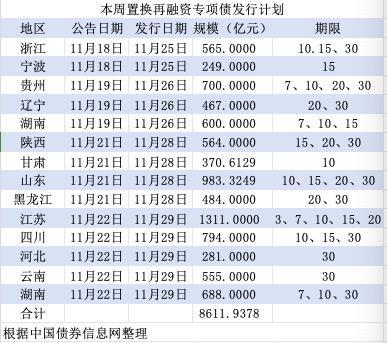 据此计算,今年发行的置换再融资专项债规模将达到2万亿。上周已有部分地区启动了发行工作,发行规模超过2000亿元。本周发行量大幅增加至8600多亿,加上其他类型的地方债,本周地方债总发行规模超过9400亿,创历史新高。