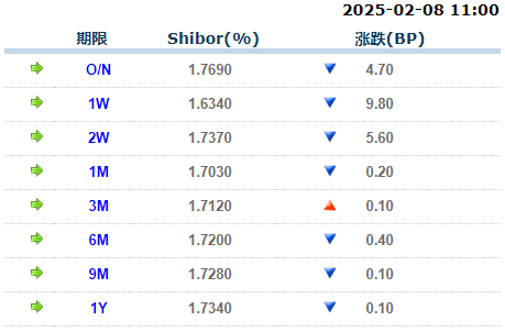 【上海银行间同业拆放利率动态】(2月8日更新)